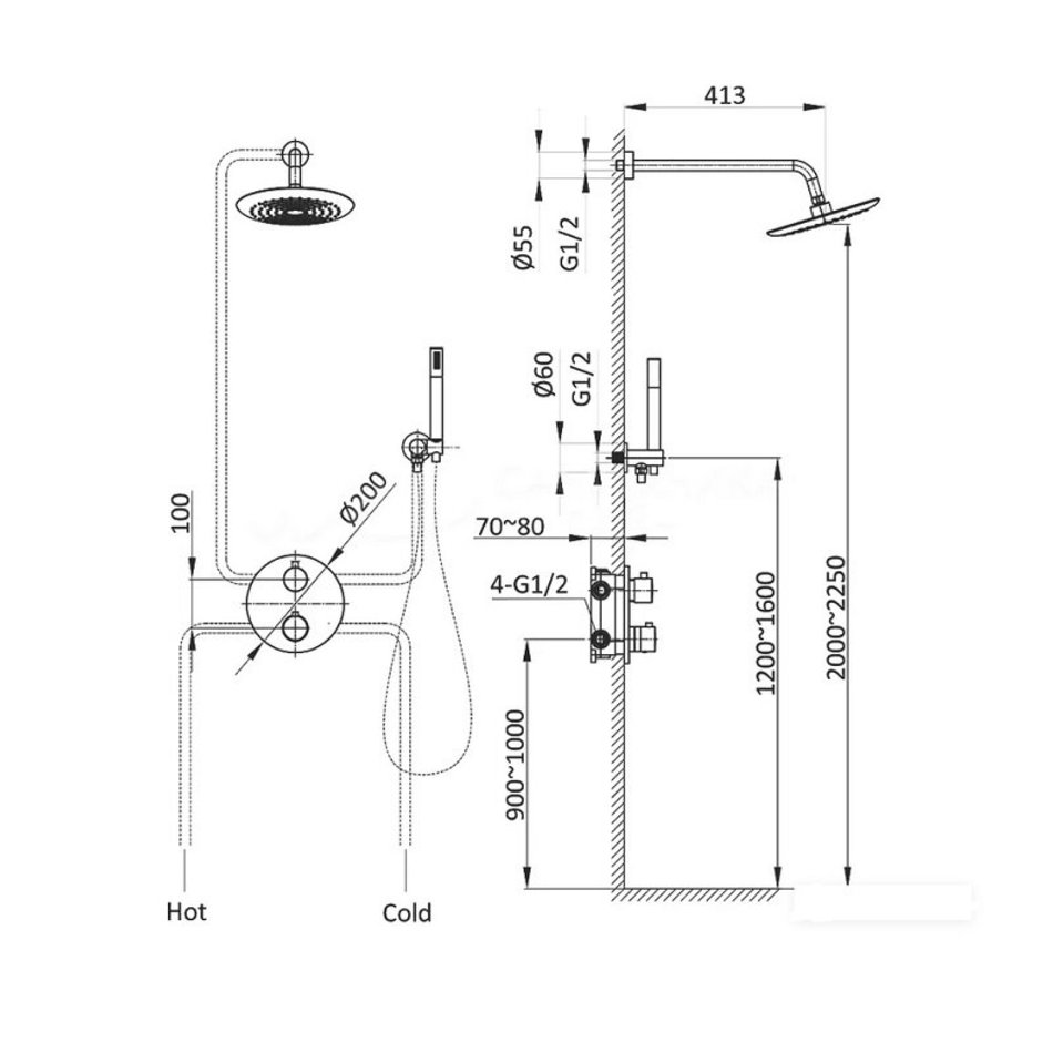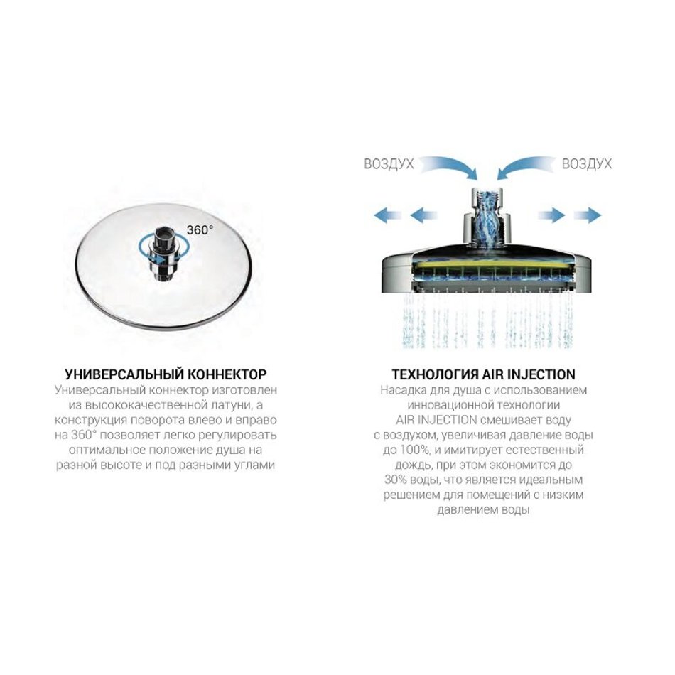 - Комплектация: верхний душ, ручной душ, смеситель со встраиваемой частью