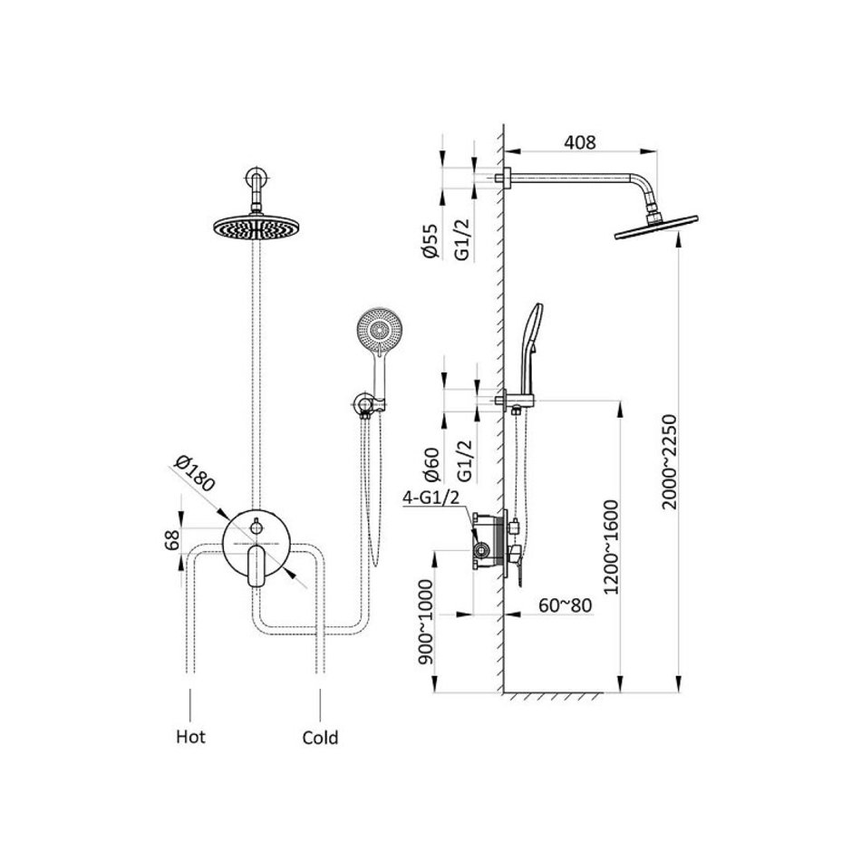 - Комплектация: верхний душ, ручной душ, смеситель со встраиваемой частью