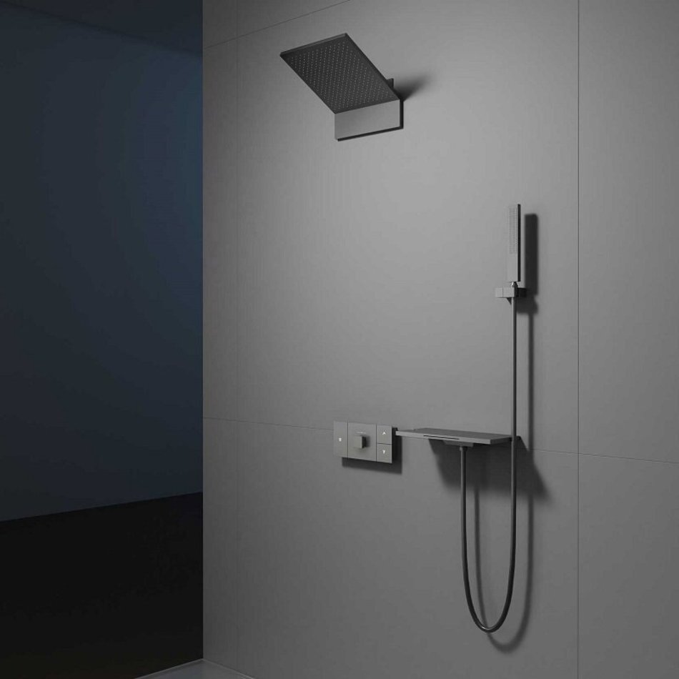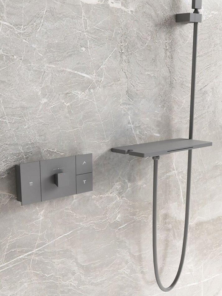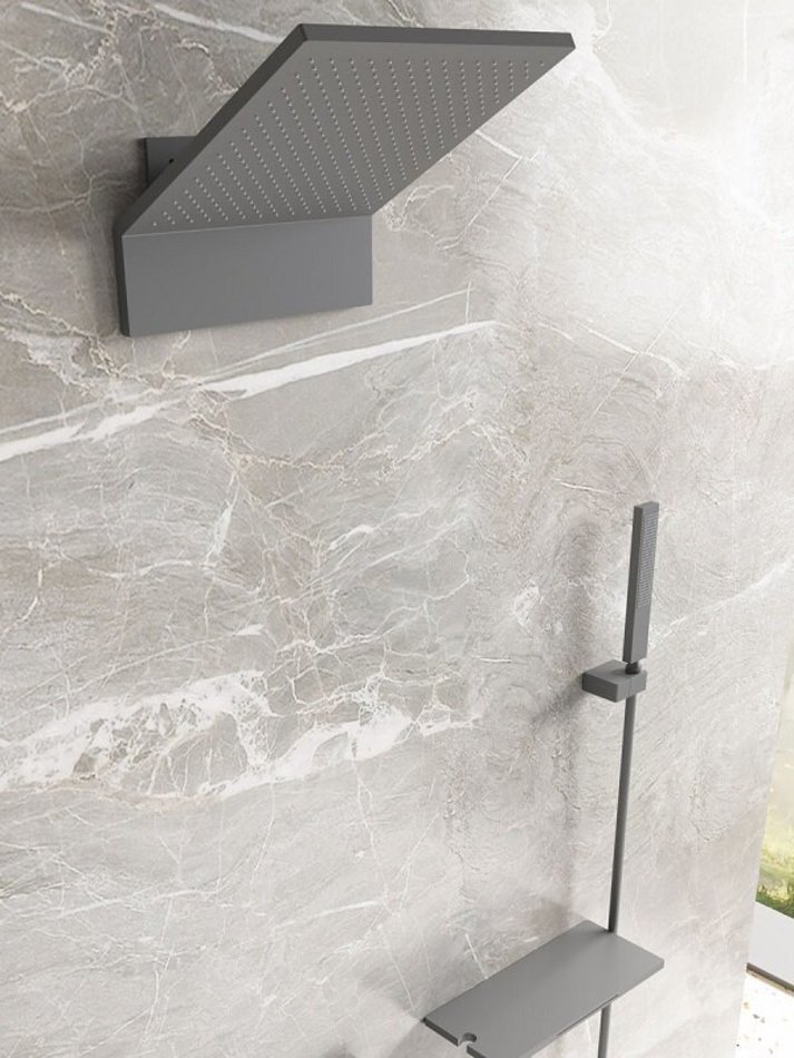 - Комплектация: верхний душ, полка с изливом и держателем ручного душа, ручной душ, смеситель со встраиваемой частью