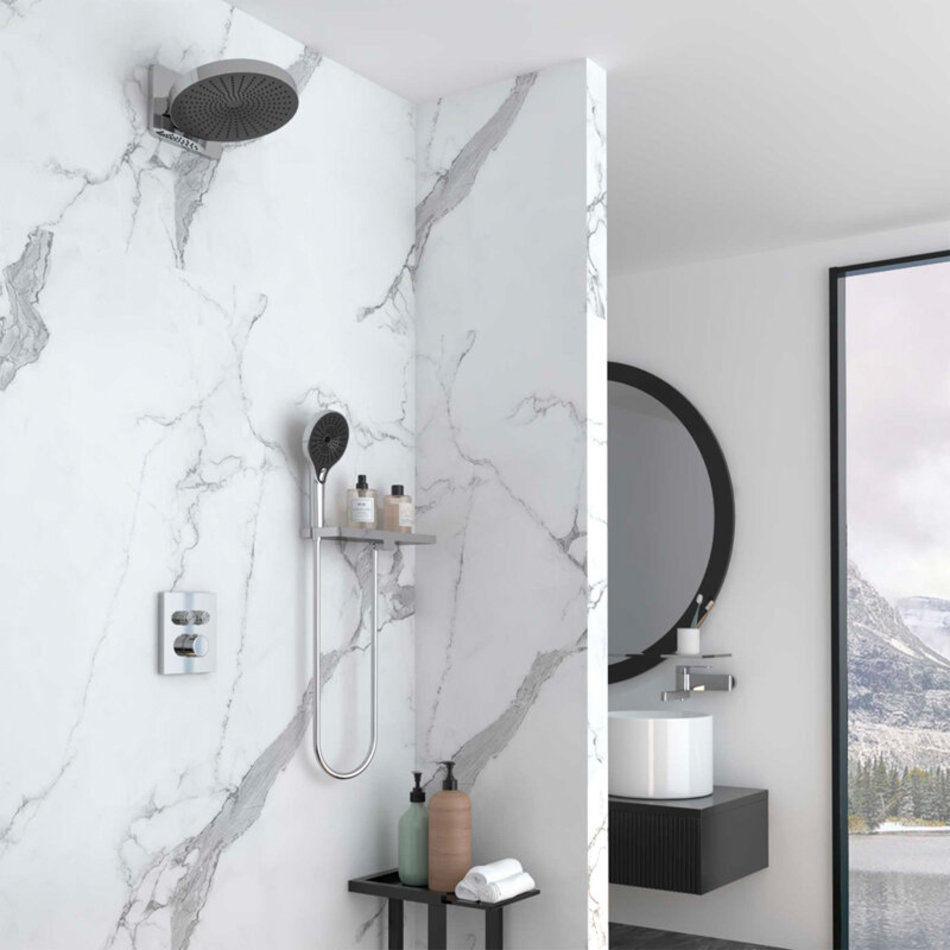 - Комплектация: Верхний душ, полка с держателем ручного душа, ручной душ, смеситель со встраиваемой частью