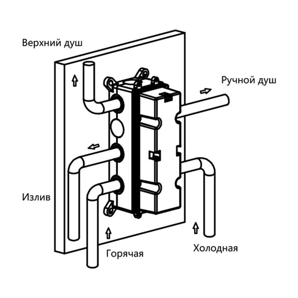- Комплектация: верхний душ, держатель ручного душа, ручной душ, встраиваемый смеситель,излив