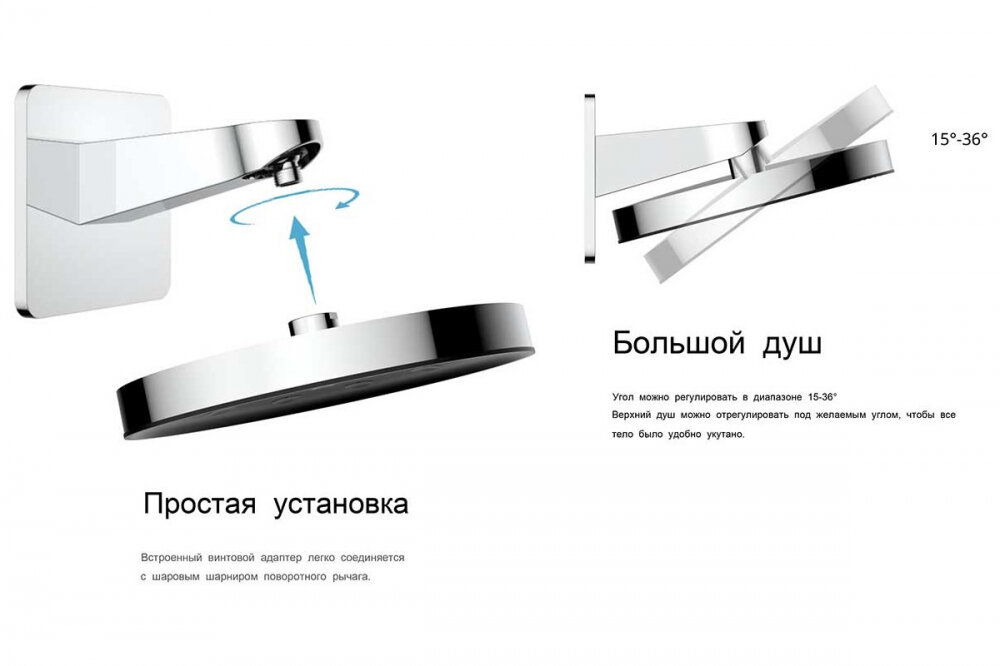 - Комплектация: верхний душ, полка с держателем ручного душа, ручной душ, встраиваемый смеситель,излив