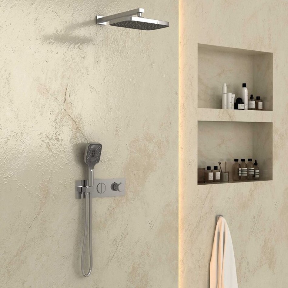 - Комплектация: верхний душ, ручной душ, смеситель со встраиваемой частью