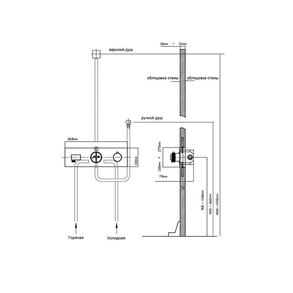 - Комплектация: верхний душ, ручной душ, смеситель со встраиваемой частью