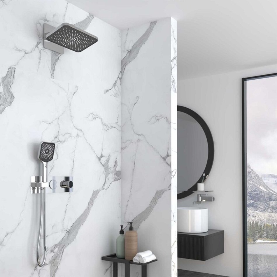 - Комплектация: верхний душ, держатель ручного душа, ручной душ, встраиваемый смеситель