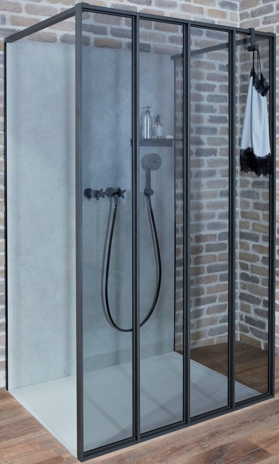 Стекло прозрачное 6 мм, анти-известковое покрытие, высота 200 см, черные алюминиевые профили со скрытой системой монтажа