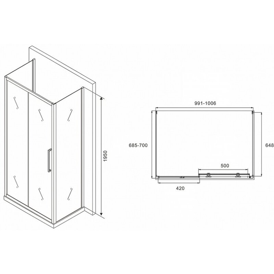 Душевой уголок Abber Schwarzer Diamant, 100 х 70 см, стекло матовое, профиль хром, AG30100MH-S70M-S70M