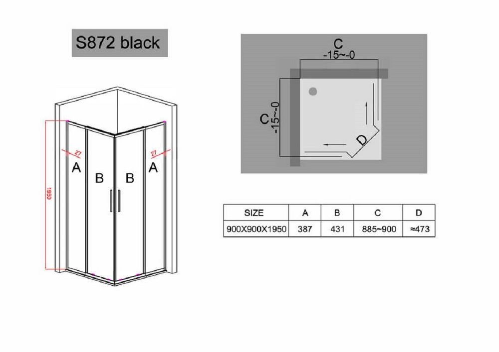Душевой уголок Black&White Stellar Wind S872 Black, 90 x 90 см, стекло прозрачное, профиль черный матовый, 8729090