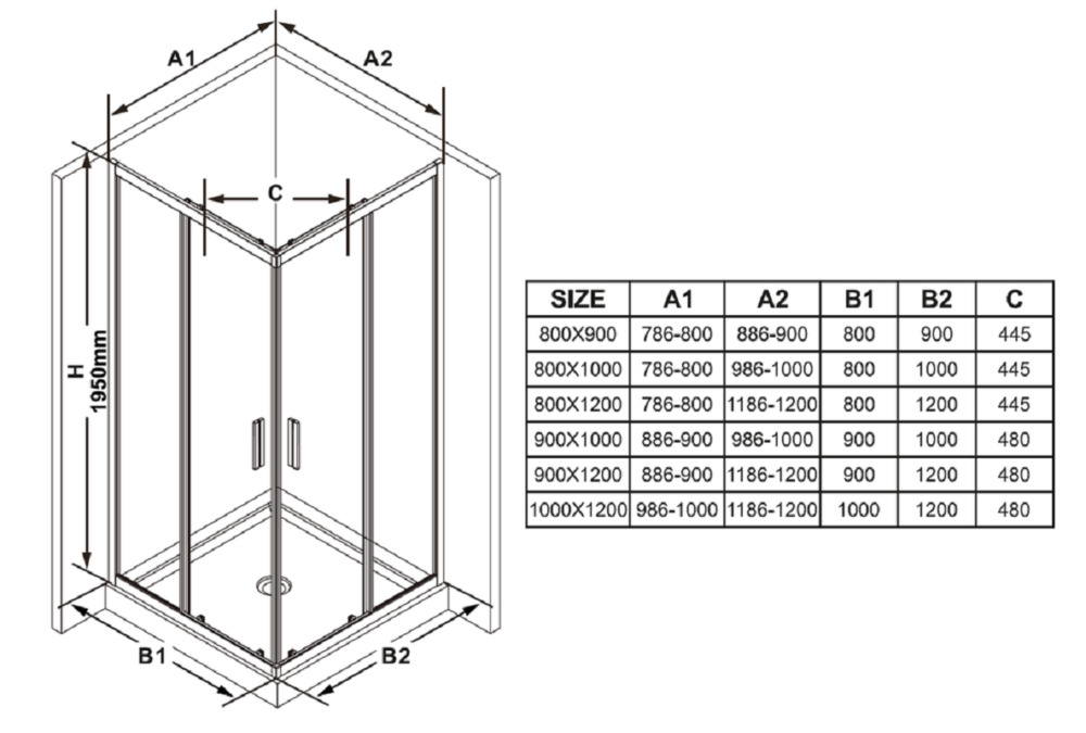 Состоит из двух неподвижных стекол и раздвижных дверей с угловым входом. Благодаря роликовому механизму открывания двери надежно работают и легко снимаются, что упрощает уход за душевым уголком.