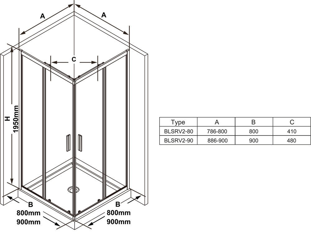 Комфортный душевой уголок квадратной формы с широким угловым входом без возможности комбинации размеров. В блестящем или черном цвете профиля.