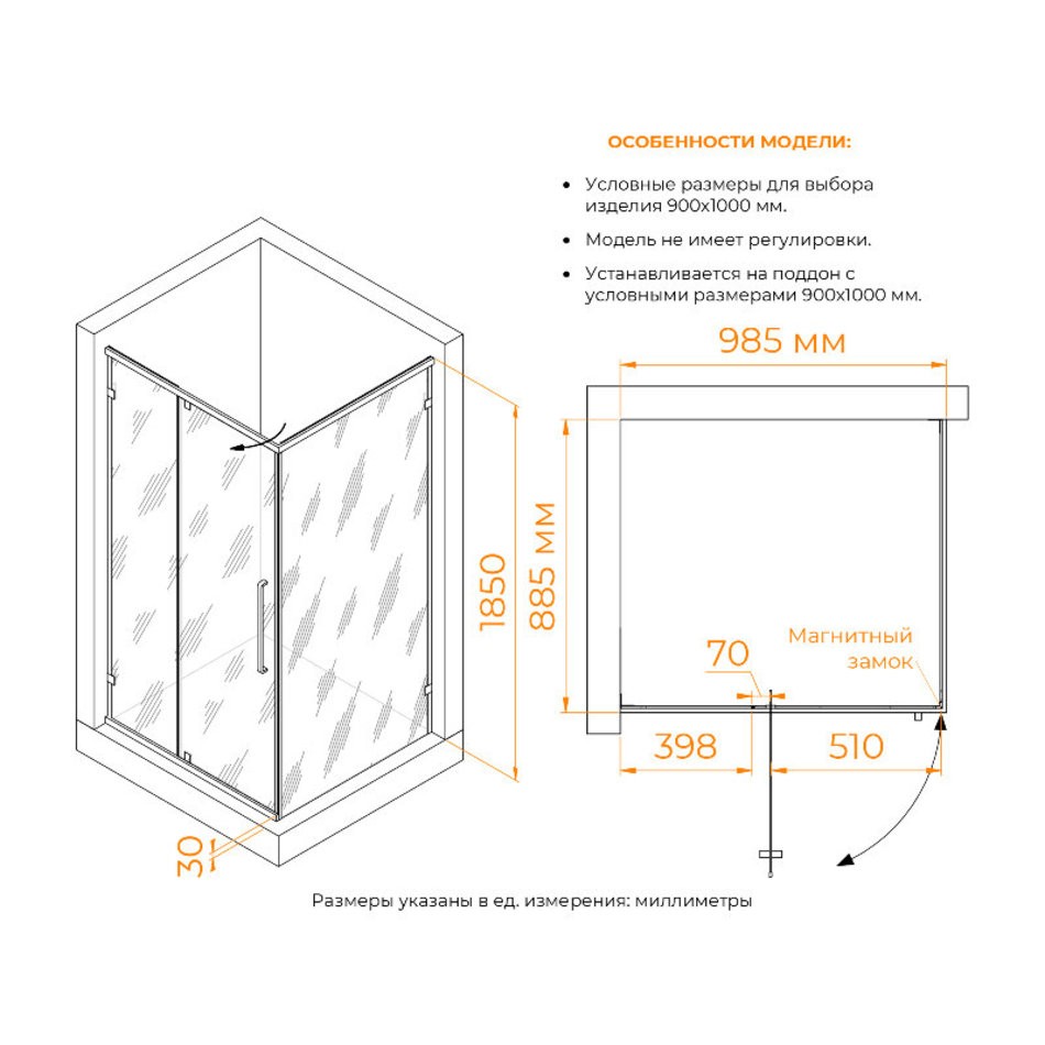 Модель представлена в чёрном исполнении профиля и фурнитуры, также обратите внимания, все уплотнители выполнены так же в чёрном цвете, что подчёркивает сдержанную стилистику душевых углов.