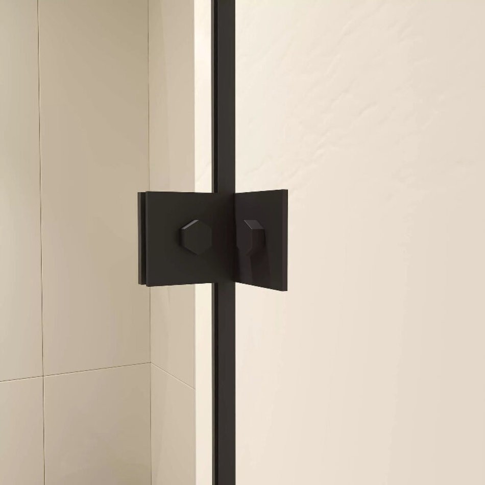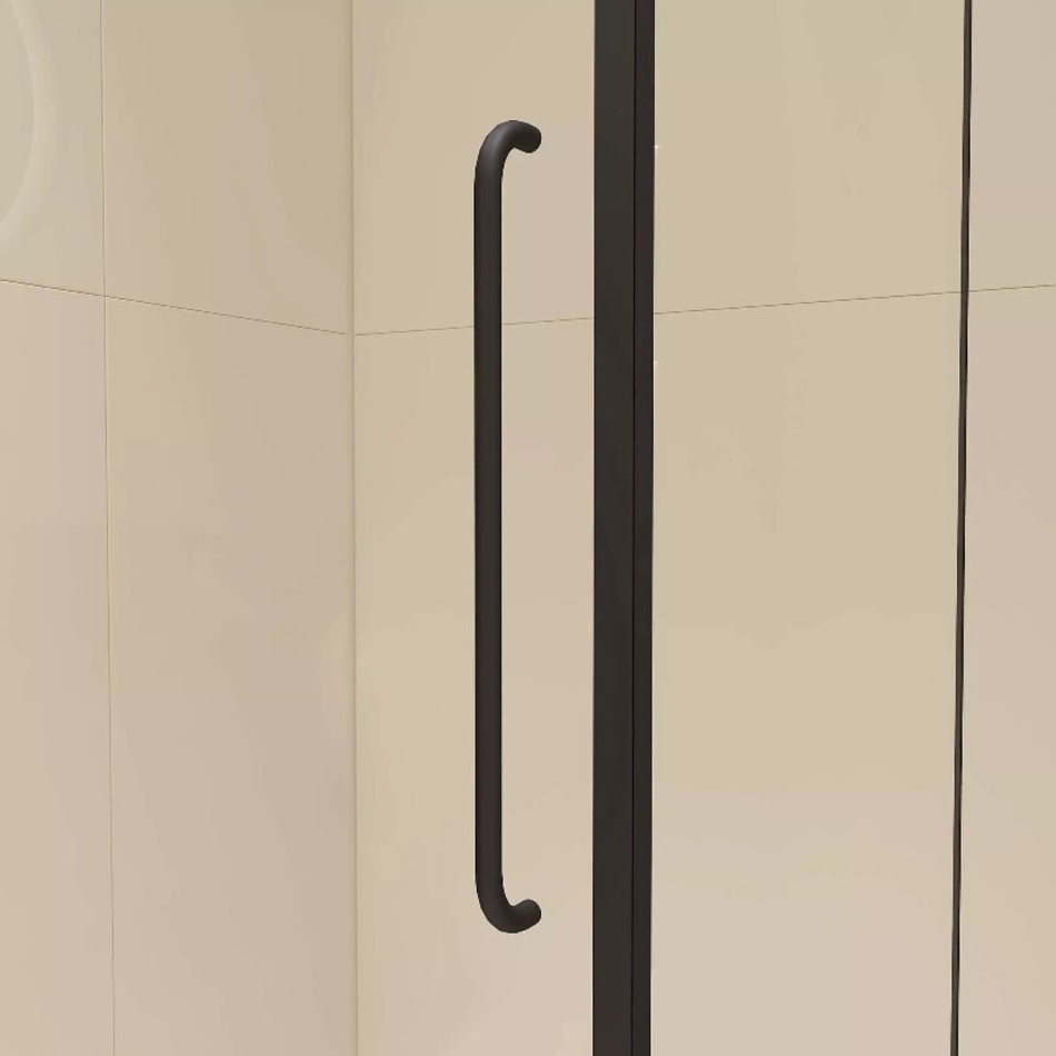 Модель представлена в чёрном исполнении профиля и фурнитуры, также обратите внимания, все уплотнители выполнены так же в чёрном цвете, что подчёркивает сдержанную стилистику душевых углов.