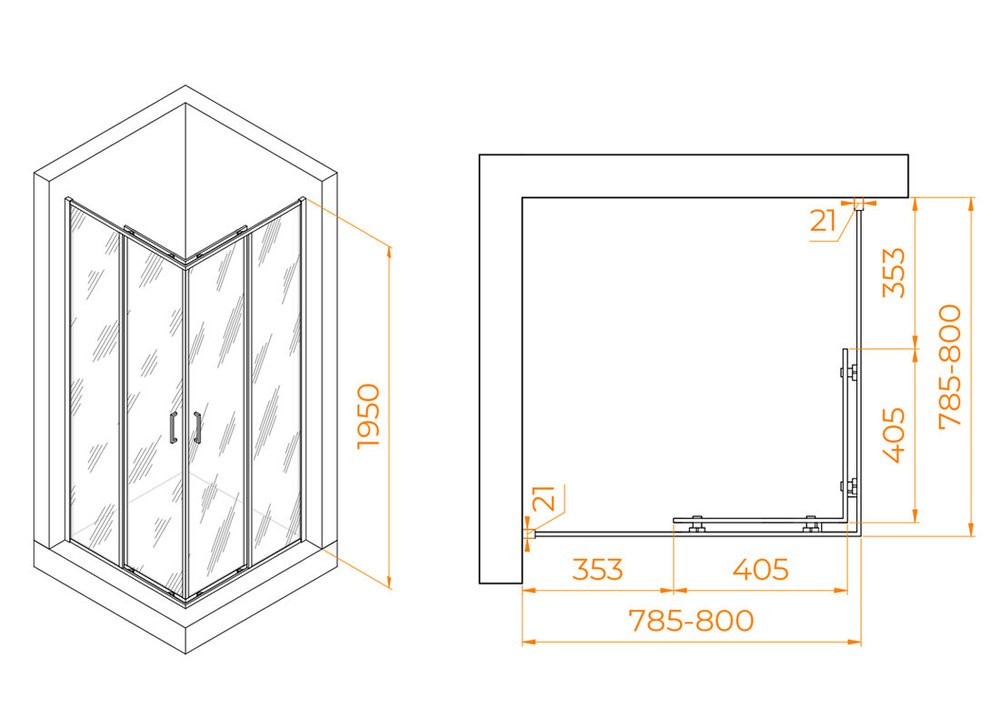 Форма душевого угла квадратная, что обеспечивает возможность осуществления установки уголка в различные углы ванной комнаты. А высота душевого угла 1950 мм позволит использовать его без неудобств, даже для высоких людей.