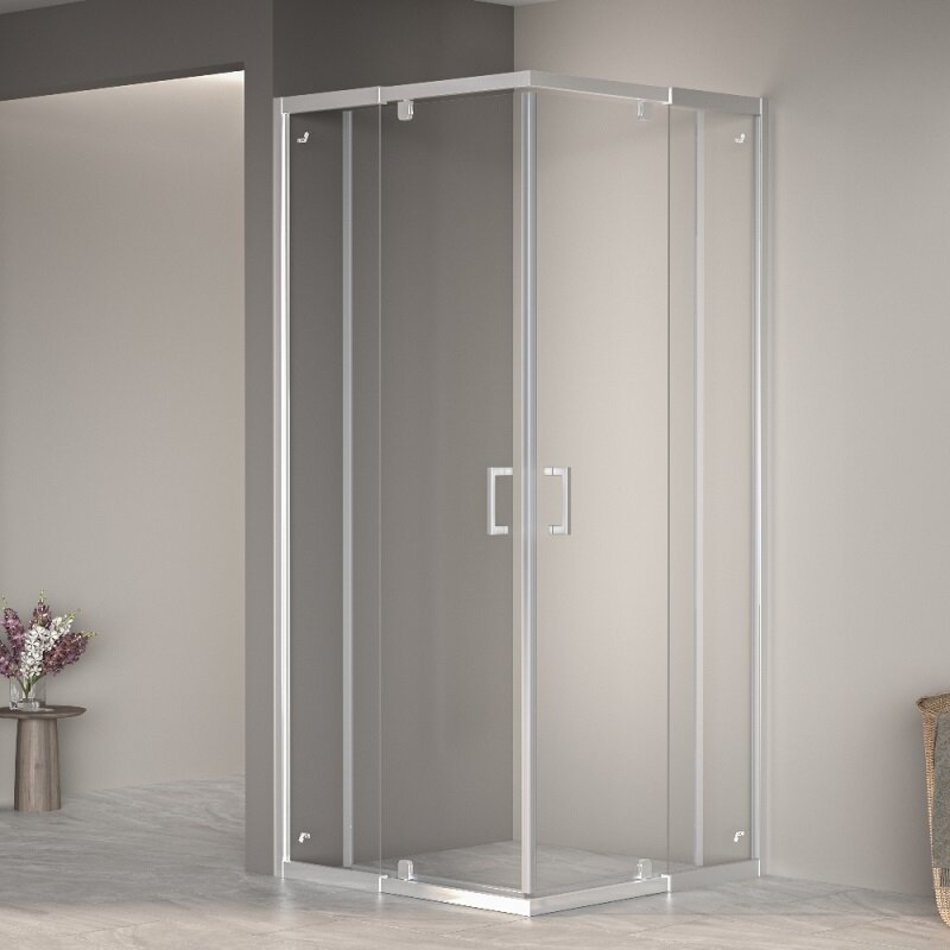 Душевой уголок квадратный с раздвижными профилями (ширина регулировки 10 см). Трап или поддон приобретается отдельно.