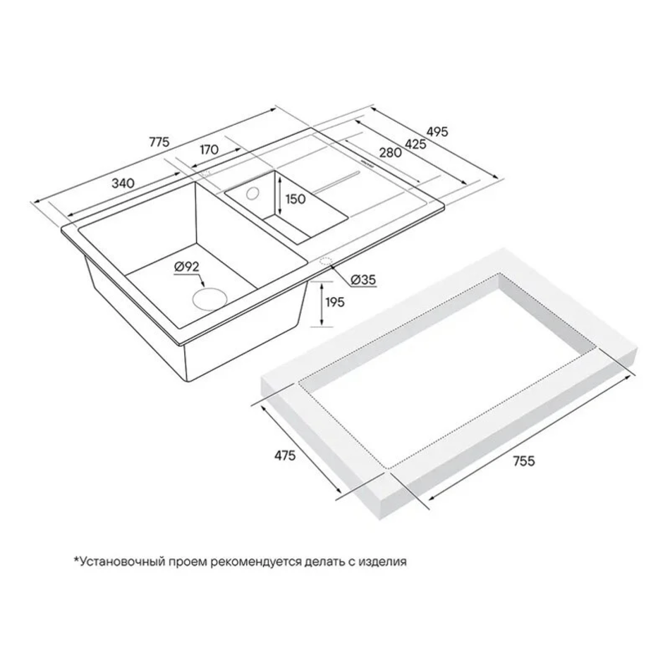 - Размер выреза: 75.5 x 47.5 см