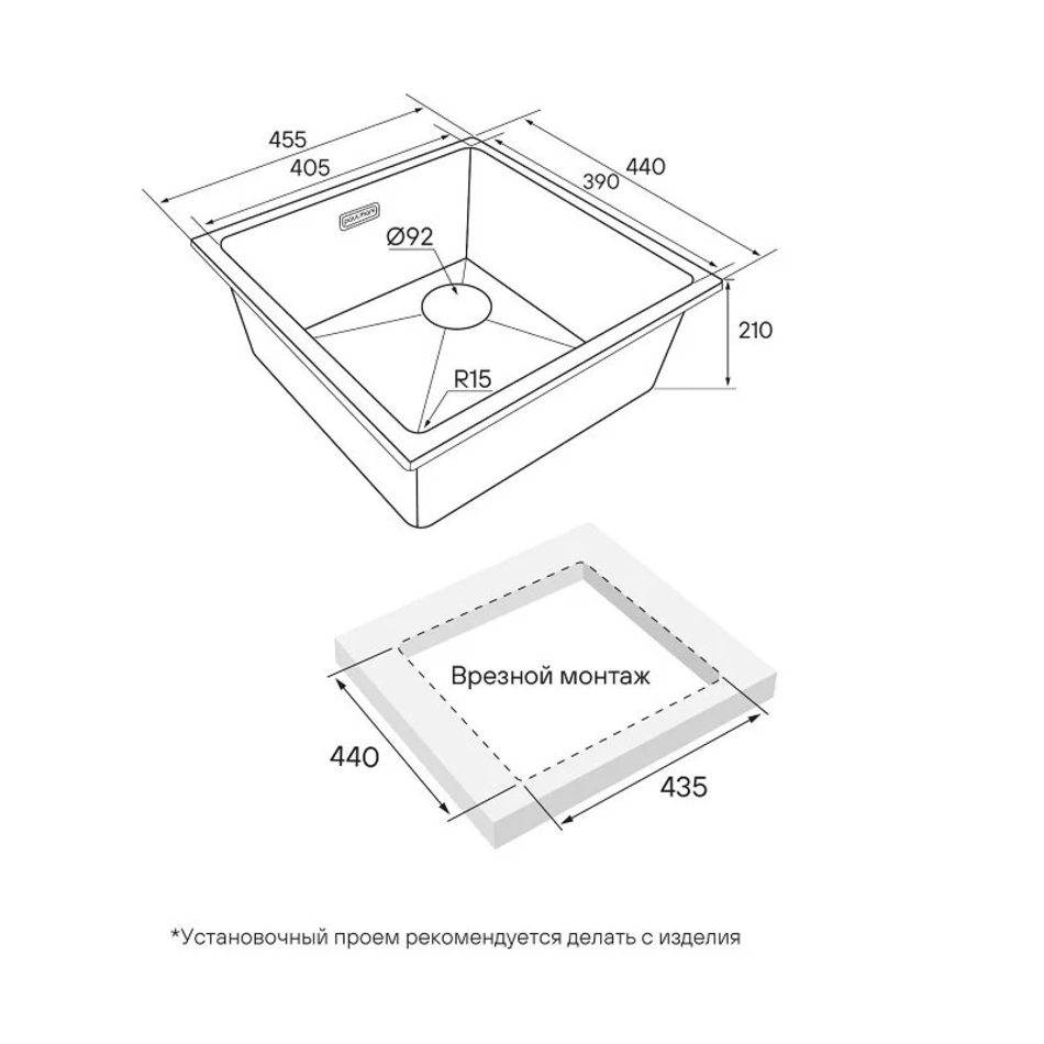 Мойка создана как для современного способа монтажа под столешницу, так и для классического врезного монтажа. Внутренние грани мойки направлены к сливу под индивидуальным углом для быстрого ухода воды. Состав мойки не вступает в реакцию с продуктами и полностью безопасен для здоровья человека. Материал мойки не нужно герметизировать, и, поскольку он не пористый, то он максимально устойчив к окрашиванию. Входит в комплект. Его конструкция позволяет увести колбу сифона к стене, что кратно увеличит свободное пространство в шкафу под мойкой. Для подстольного типа монтажа в комплекте к мойке предусмотрен крепеж