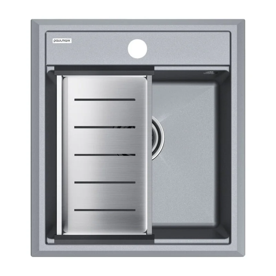 Мойка кухонная Paulmark Stepia PM114651-GRM+A375-BS, 45 см, искусственный камень, с коландером Advance, серый металлик/брашированная нержавеющая сталь