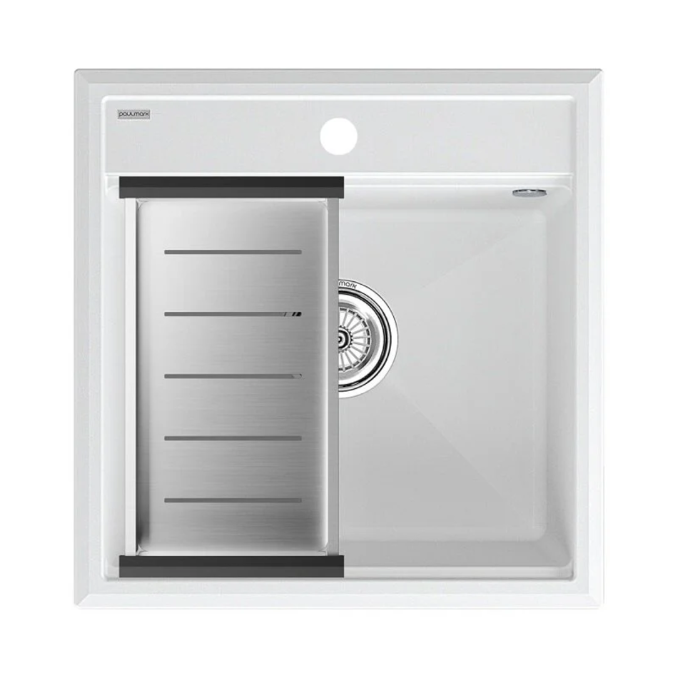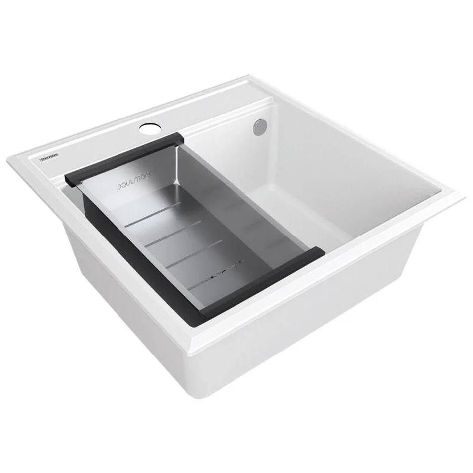 Мойка кухонная Paulmark Stepia PM115051-WH+A375-BS, 50 см, искусственный камень, с коландером Advance, белый/брашированная нержавеющая сталь