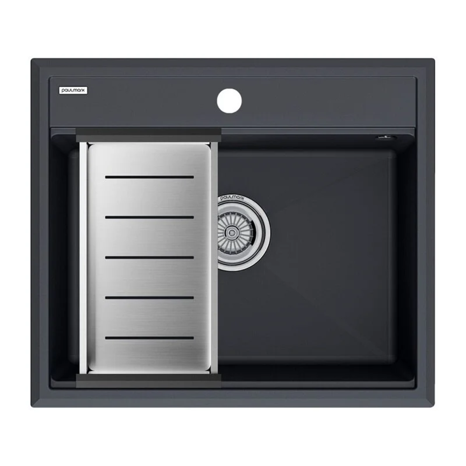 Мойка кухонная Paulmark Stepia PM115951-AN+A375-BS, 60 см, искусственный камень, с коландером Advance, антрацит/брашированная нержавеющая сталь