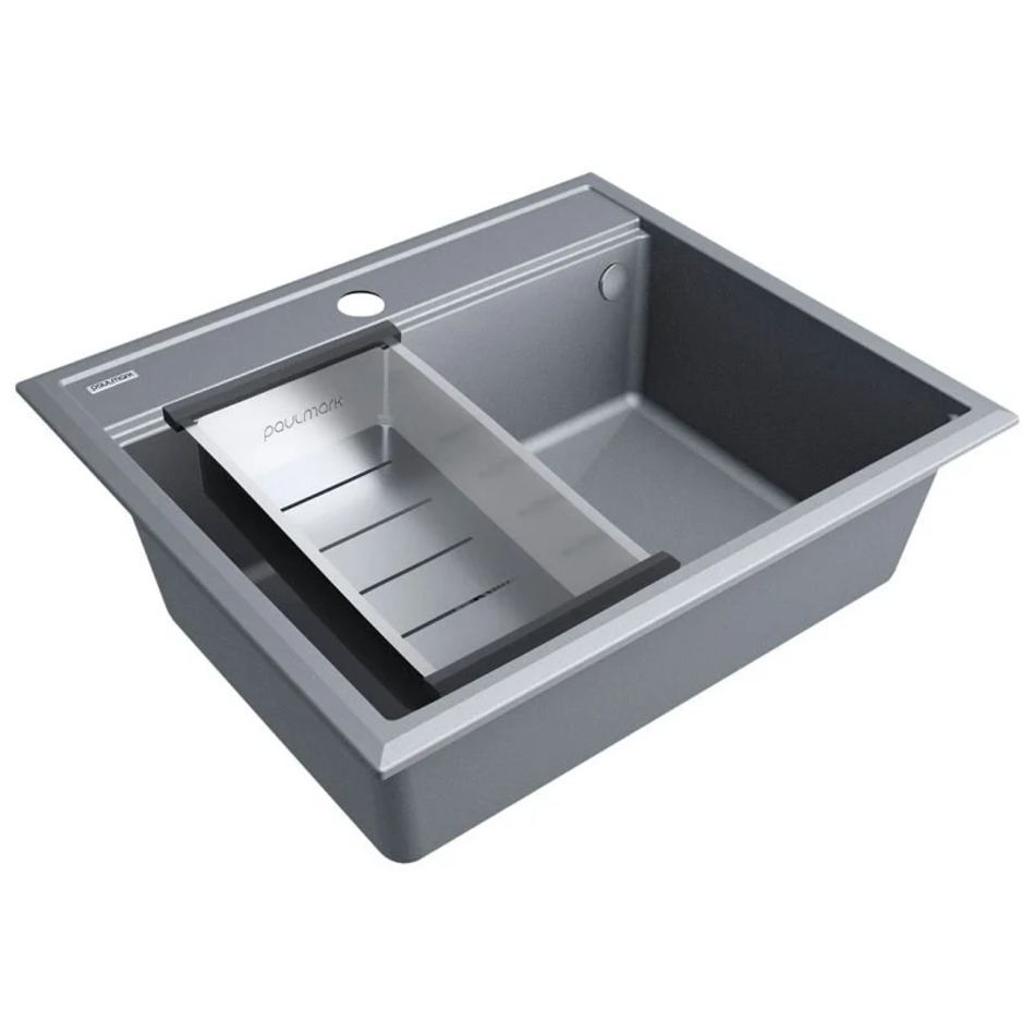 Мойка кухонная Paulmark Stepia PM115951-GRM+A375-BS, 60 см, искусственный камень, с коландером Advance, серый металлик/брашированная нержавеющая сталь