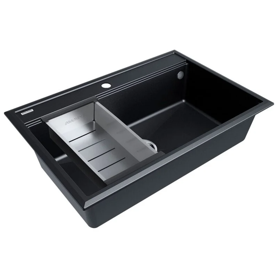 Мойка кухонная Paulmark Stepia PM117551-BLM+A375-BS, 80 см, искусственный камень, с коландером Advance, черный металлик/брашированная нержавеющая сталь