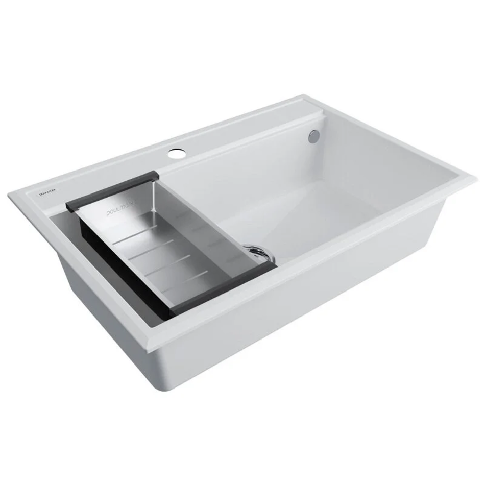 Мойка кухонная Paulmark Stepia PM117551-WH+A375-BS, 80 см, искусственный камень, с коландером Advance, белый/брашированная нержавеющая сталь