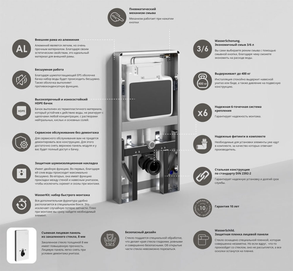 Пристенный модуль системы инсталляции WasserKraft Naab 86, для унитазов, цвет - белый, 86TLT.040.PE.WH