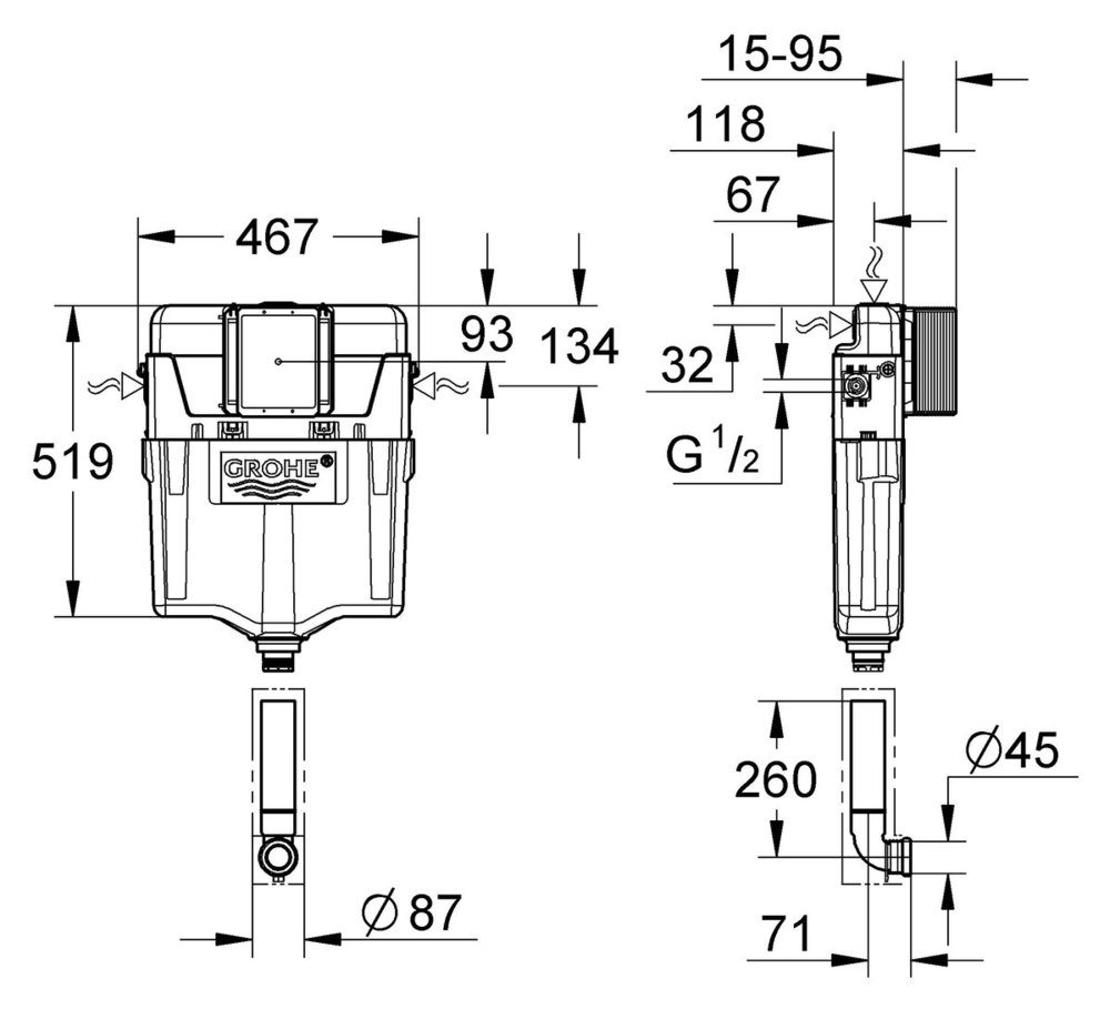 Смывной бачок Grohe Rapid SL ( Рапид СЛ ) 38661000, скрытый монтаж, пневматический привод смывного устройства.Регулировка объёма смыва от 6 до 9 л.;Пневматический смывной клапан с тремя режимами слива: 2-х объёмный, старт/стоп, или непрерывный;Подключение воды: справа, слева, сзади или сверху;Арматурная группа с изоляцией от конденсационной влаги;Подключение воды DN 15 со встроенным запорным вентилем;С крепежными накладками;