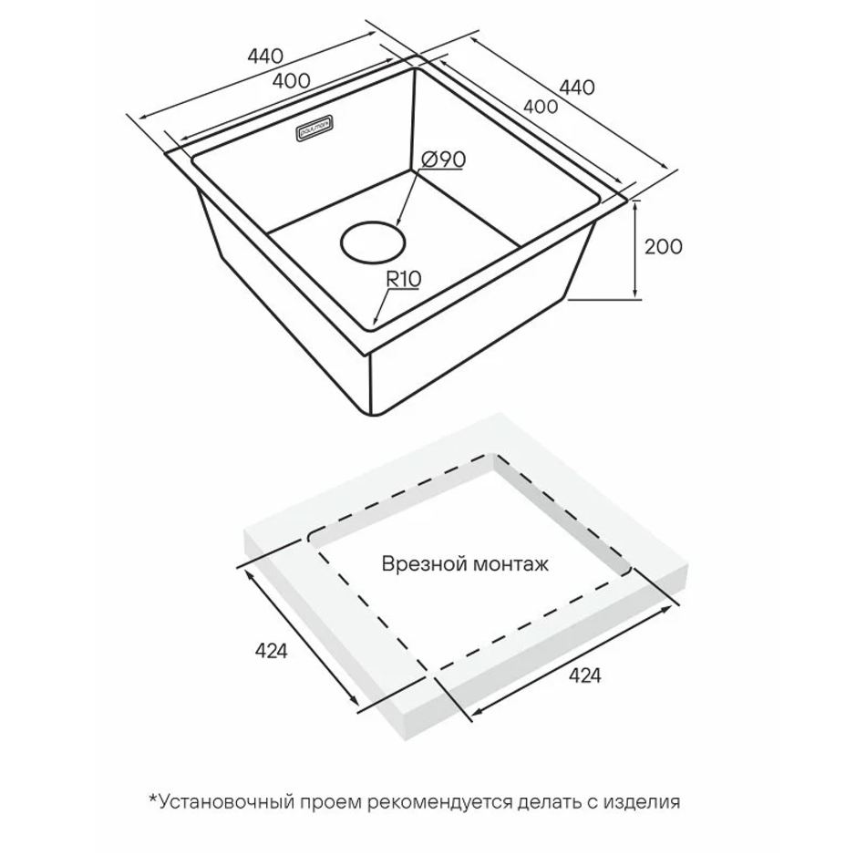 Монтаж:Мойки LASSAN UNI могут быть установлены как врезным способом поверх столешницы, так и под столешницу (подстольный монтаж).