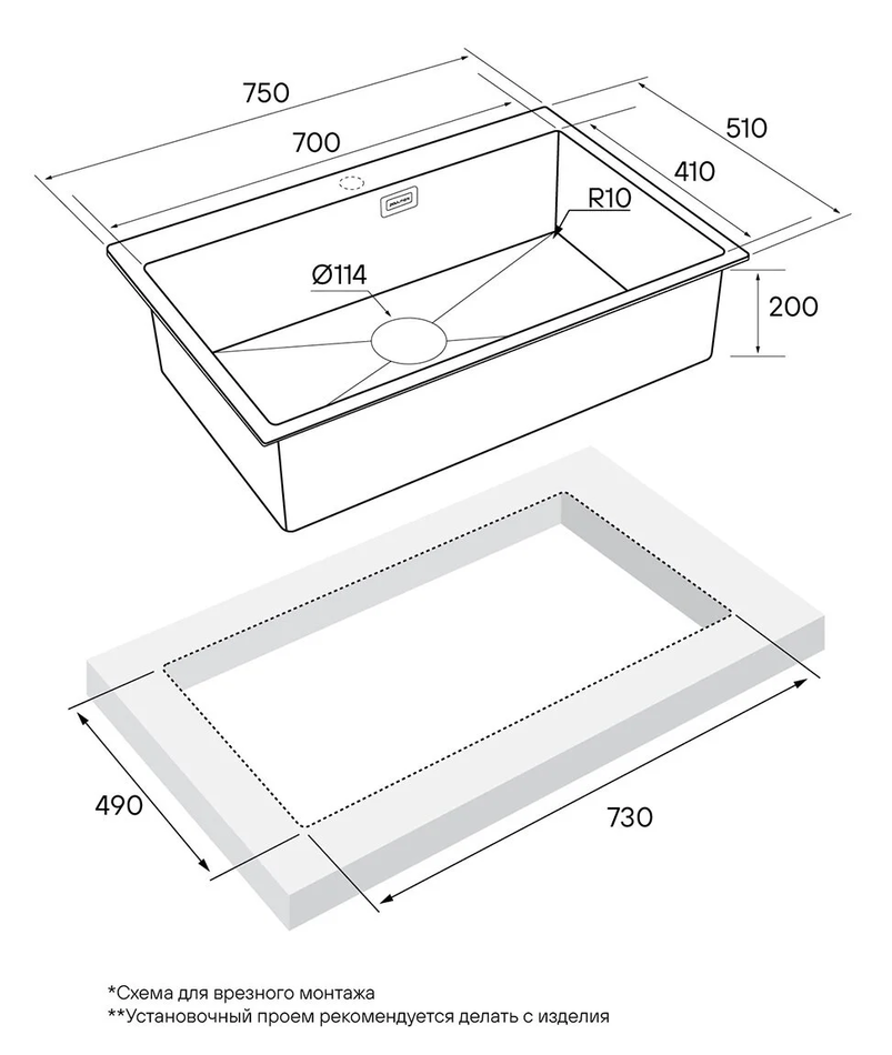 - Установка: в один уровень со столешницей / встраиваемый сверху / встраиваемый снизу