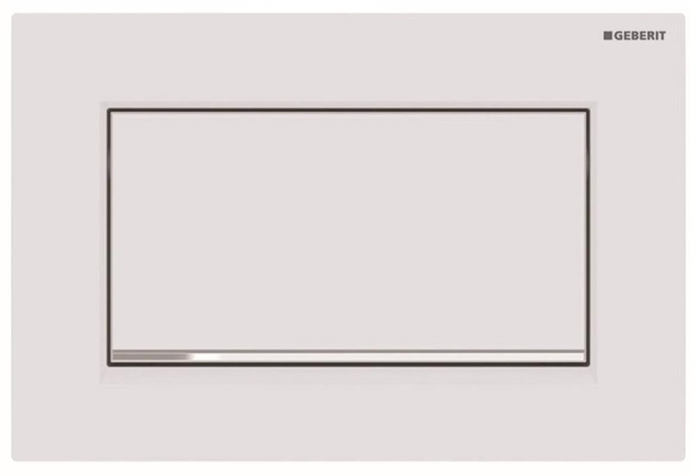 Смывная клавиша Geberit Sigma30 115.893.JT.1, одинарный смыв. Панель и клавиши: белый матовый лак, легко чистящееся покрытие. Декоративные полоски: глянцевый хром. Материал: сплав на основе цинка.