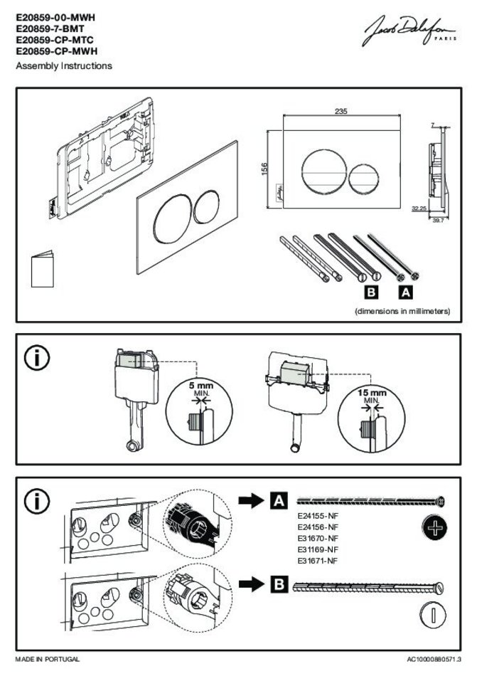 Клавиша смыва Jacob Delafon, белый матовый и глянцевый, E20859-00-MWH