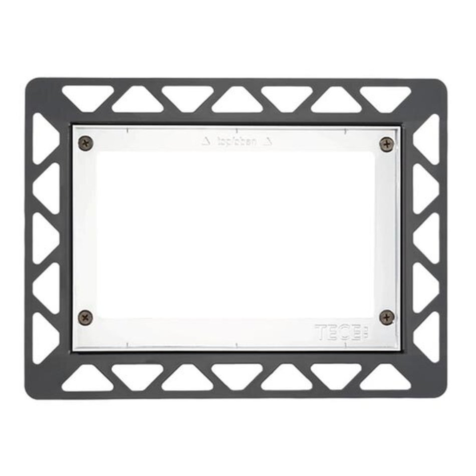 Монтажный комплект для установки стеклянных панелей смыва унитаза TECEloop/TECEsquare, TECElux Mini, а также TECEnow на уровне стены. Рамка для облицовки стеновой плиткой с регулированием глубины в диапазоне 5–18 мм (18–33 мм с использованием регулировочных болтов — арт. 9820181). В комплект входит инструмент для монтажа/демонтажа панели смыва.