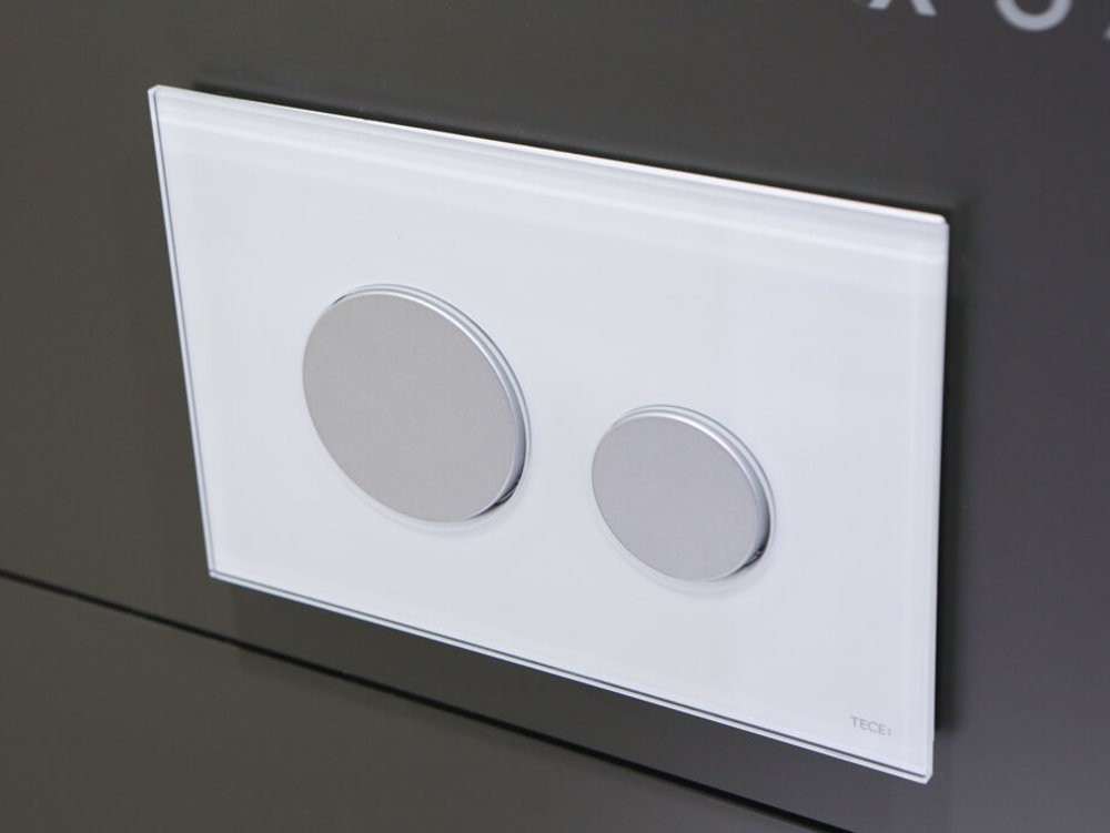 Панель смыва для смывных бачков TECE, фронтальная или верхняя установка. Плоская стеклянная панель смыва с двумя установленными на пружинах клавишами смыва. Подходит для монтажа на уровне стены вместе с монтажной рамкой унитаза (например: 9240649). Совместима с контейнером для гигиенических таблеток