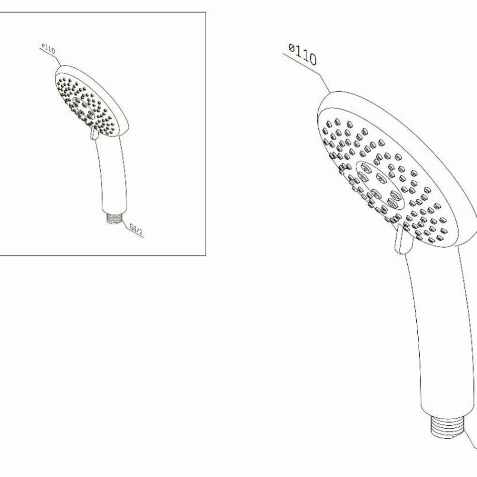 Ручной душ: диаметр 110 мм, 3 режима ручного душа, переключатель режимов Turning Switch, функция Rub&Clean для легкой очистки душевых форсунок, функция Air In для повышения эффективности и экономии воды.