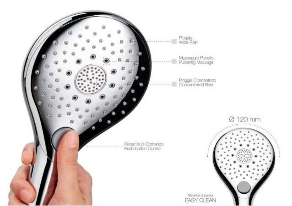 Типы струи: Широкий дождь, Концентрированный дождь, Пульсирующий массаж, а также комбо-режимы, когда одновременно работают 2 типа струи
