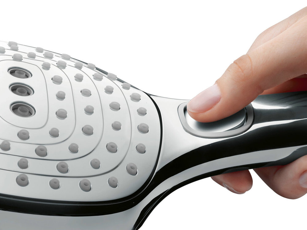 Ручной душ Raindance Select E 120 3jet с хромированными поверхностями, белым душевым диском и мягким прямоугольным силуэтом доставляет радость в чистом виде и предлагает на выбор три типа струи нажатием кнопки: он дарит расслабляющее, бодрящее или освежающее удовольствие под душем