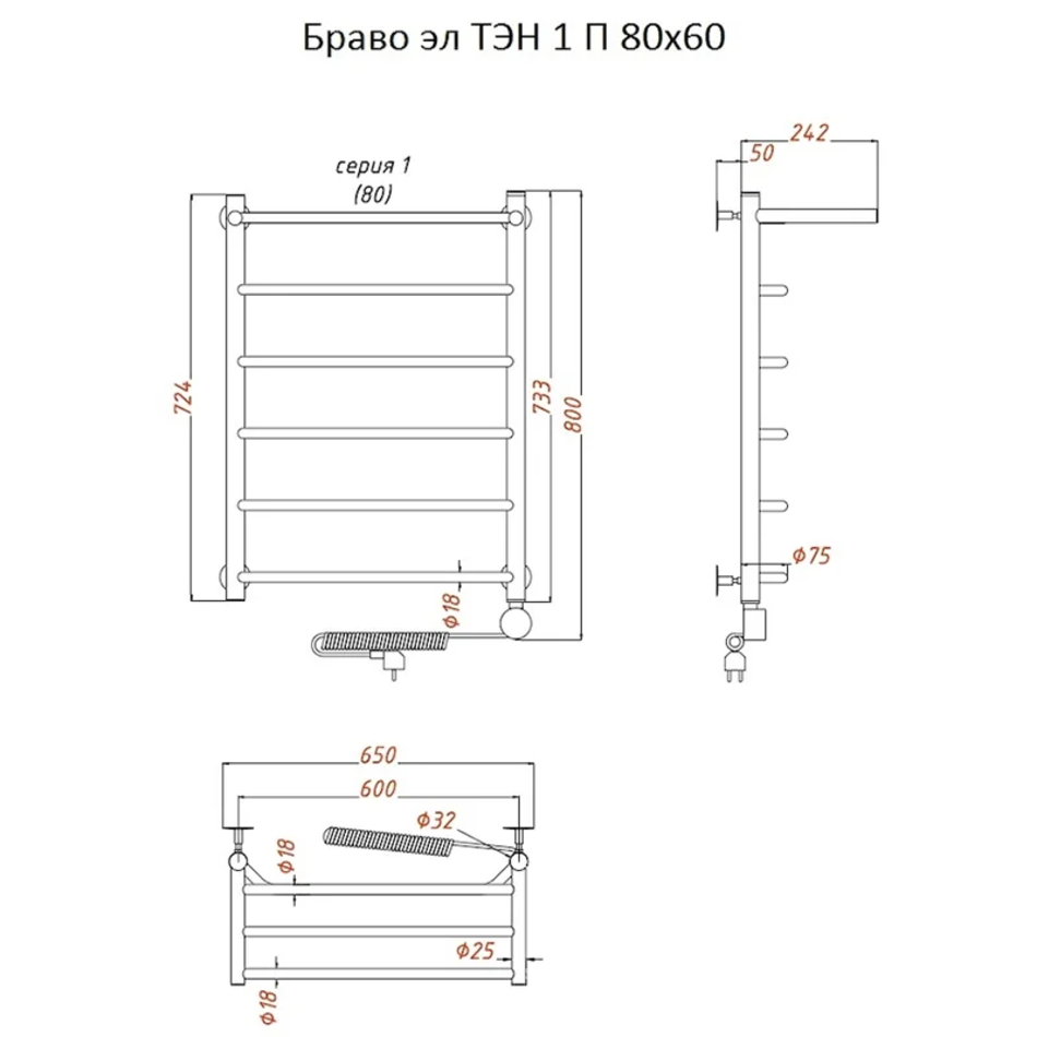Полотенцесушитель Тругор Браво эл ТЭН 1 П 80*60 (ЛЦ4), ширина 60 см, высота 80 см, с полкой, хром