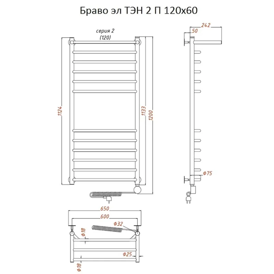 Полотенцесушитель Тругор Браво эл ТЭН 2 П 120*60 (ЛЦ4), ширина 60 см, высота 120 см, с полкой, хром