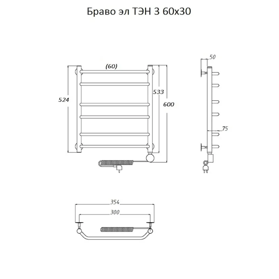 Полотенцесушитель Тругор Браво эл ТЭН 3 60*30 (ЛЦ4), ширина 30 см, высота 60 см, хром