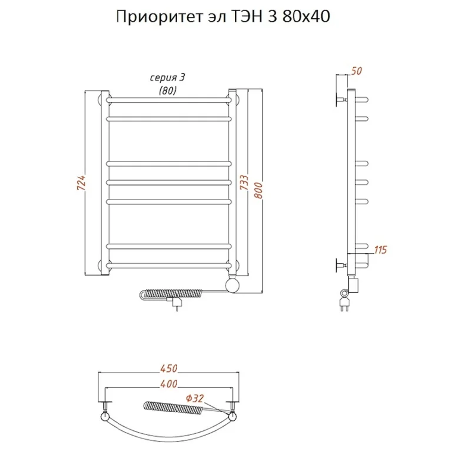 Полотенцесушитель Тругор Приоритет эл ТЭН 3 80*40 (ЛЦ2), ширина 40 см, высота 80 см, хром