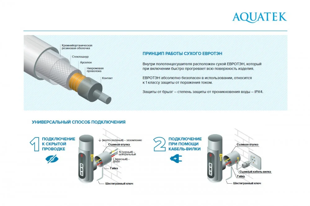 Комплектация: полотенцесушитель; съемная кабель-вилка (длина 1,2м); втулки-переходники для подключения 2 шт; крепления к стене 4шт; шестигранный ключ 1 шт.
