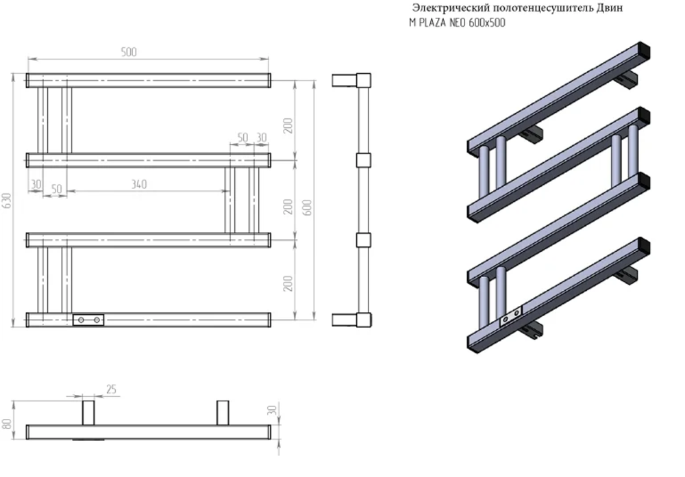 Полотенцесушитель электрический Двин M plaza neo 60/50, 4657771771231, ширина 50 см, высота 63 см, диммер справа, черный матовый
