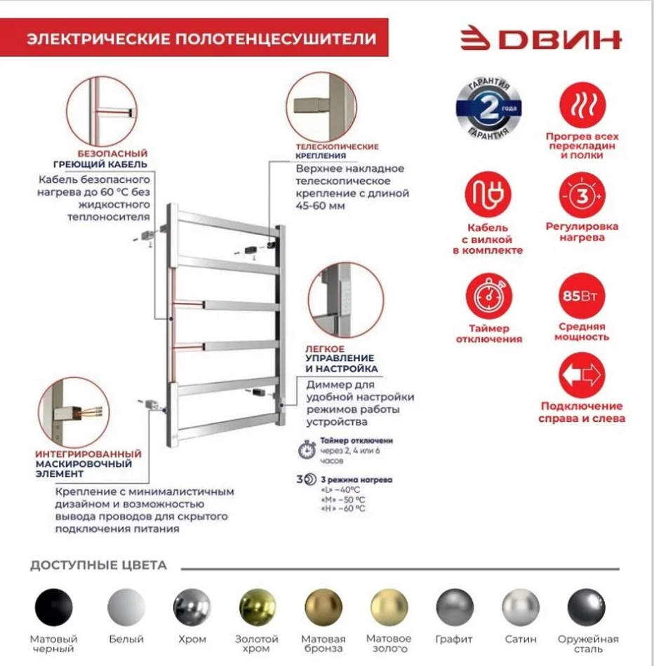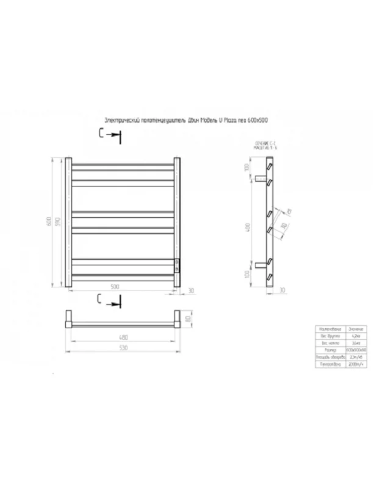 Полотенцесушитель электрический Двин U plaza neo 60/50, 4657801249983, ширина 53 см, высота 60 см, диммер справа, графит