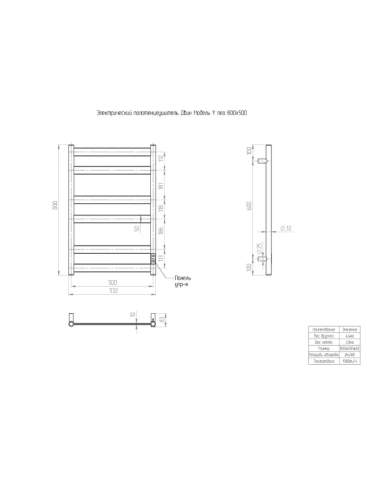 Полотенцесушитель электрический Двин Y neo 80/50, 4657812418361, ширина 53 см, высота 80 см, диммер справа, белый