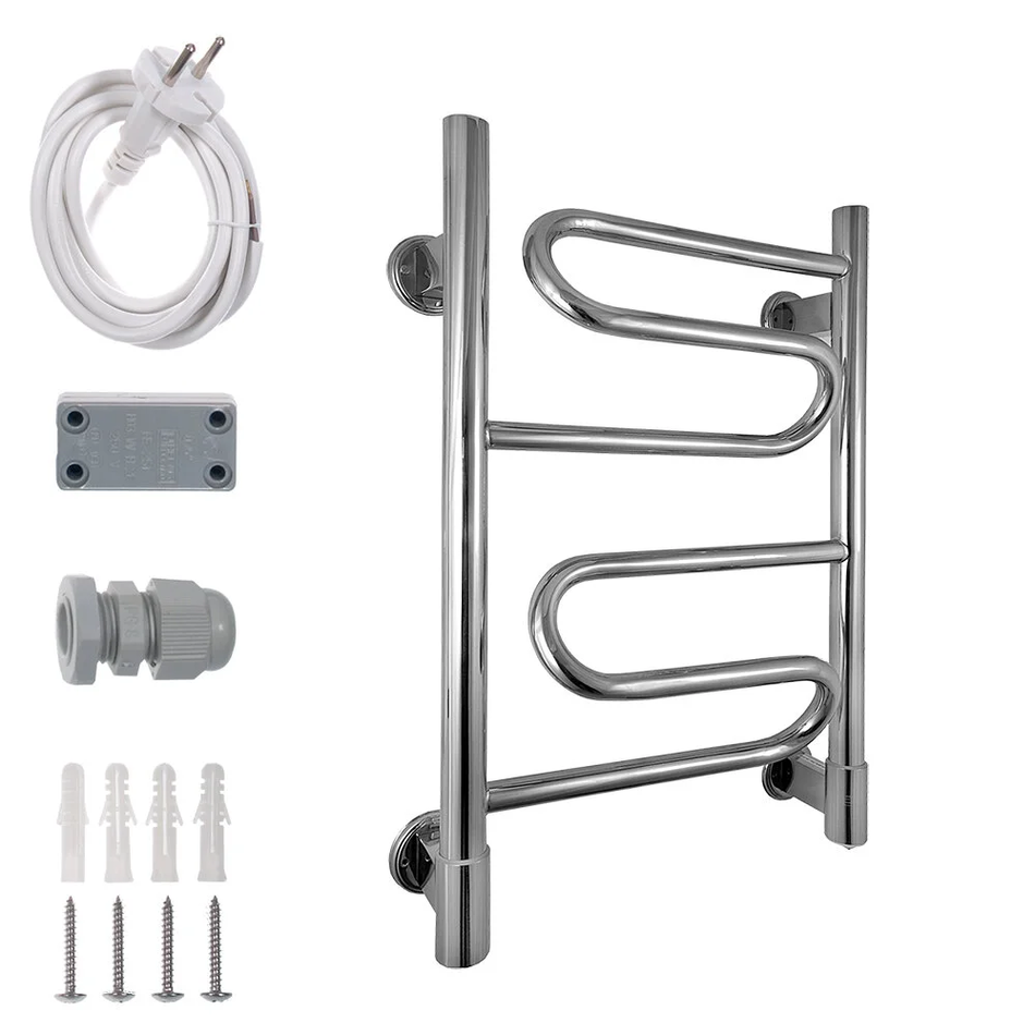 Комплектация: полотенцесушитель на кронштейнах — 1 шт.; электрический шнур (150 см) с вилкой — 1 шт.; муфта переходная для подключения электрического шнура — 1 шт.; уплотнительные прокладки — комплект; шурупы с дюбелями — комплект; инструкция — 1 шт.