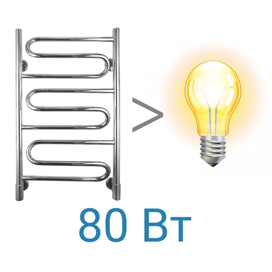 Полотенцесушитель электрический Energy Bravo 80x50 мощностью 80 Вт экономичен в эксплуатации и сопоставим по энергозатратам с электрической лампочкой.