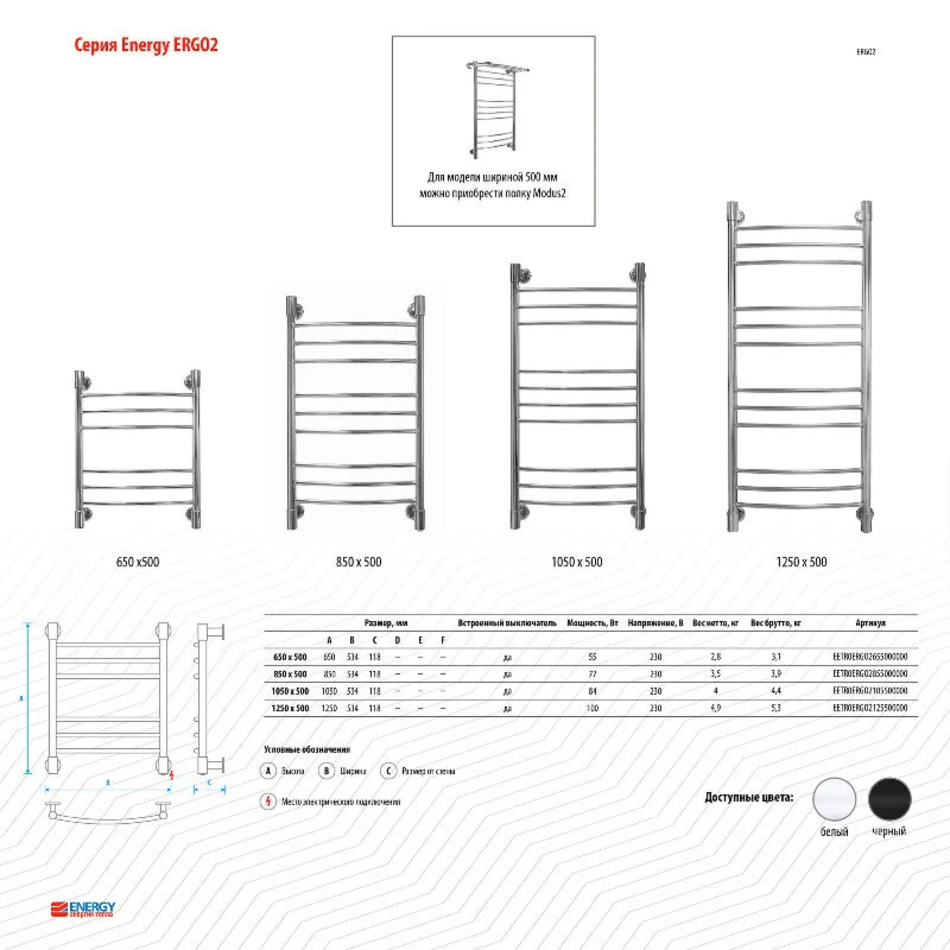 Energy Ergo2 1050x500 RAL 9003 – электрический стационарный полотенцесушитель-лесенка белого матового цвета с десятью выпуклыми перемычками круглого сечения, выполненный из высококачественной пищевой нержавеющей стали. Для увеличения функциональности и полезной площади изделия рекомендуется приобрести полку Energy Modus2 500.