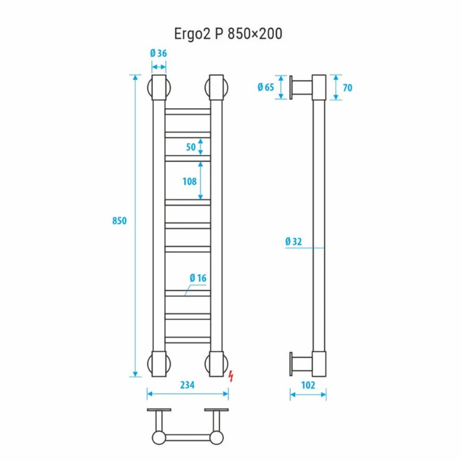 Energy Ergo2 P 850x200 прямой – узкий электрический стационарный полотенцесушитель-лесенка с девятью прямыми перемычками круглого сечения, выполненный из высококачественной пищевой нержавеющей стали. Небольшая ширина полотенцесушителя (всего 234 мм) позволяет размещать его на ограниченной площади, например, в узких нишах и простенках.