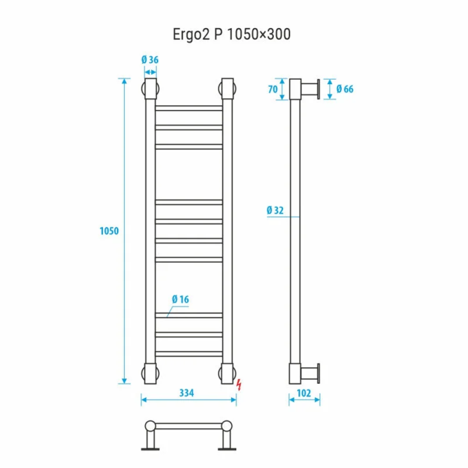 Energy Ergo2 P 1050x300 прямой – узкий электрический стационарный полотенцесушитель-лесенка с прямыми перемычками круглого сечения, выполненный из высококачественной пищевой нержавеющей стали. Небольшая ширина полотенцесушителя (всего 334 мм) позволяет устанавливать его на небольшой площади, например, в узких нишах и простенках.